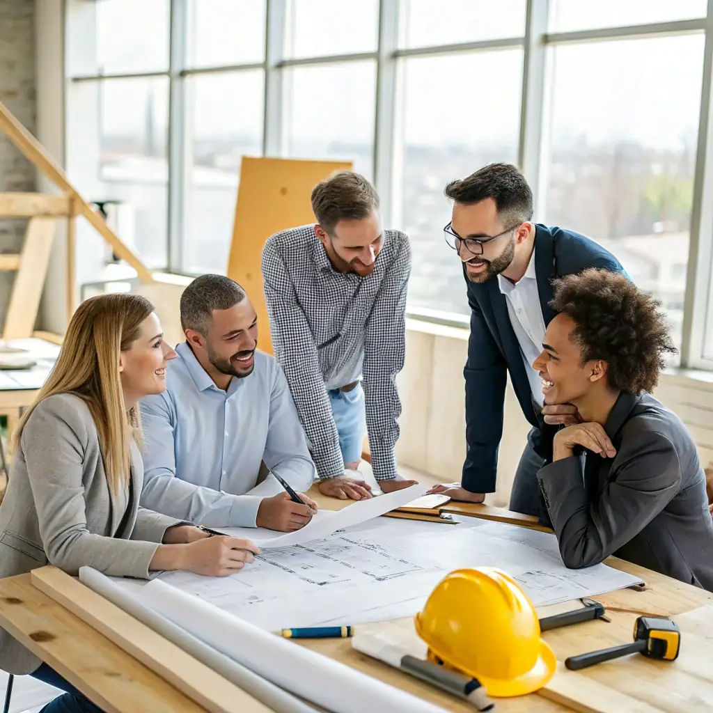 A construction site with workers wearing safety helmets and vests, collaborating on interior construction work, showcasing teamwork and expertise.
